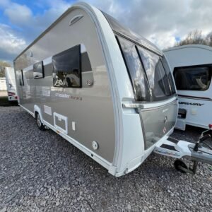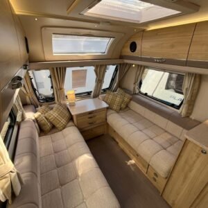 This eight-foot wide caravan features a robust build with GRP Sunsation high-gloss Rembrandt silver side panels for exceptional weather resilience and modern aerodynamic styling. Inside, the cabin is flooded with ambient light through a stargazer rooflight and front sunroof, while the Alde 24-hour programmable central and water heating system ensures year-round comfort.