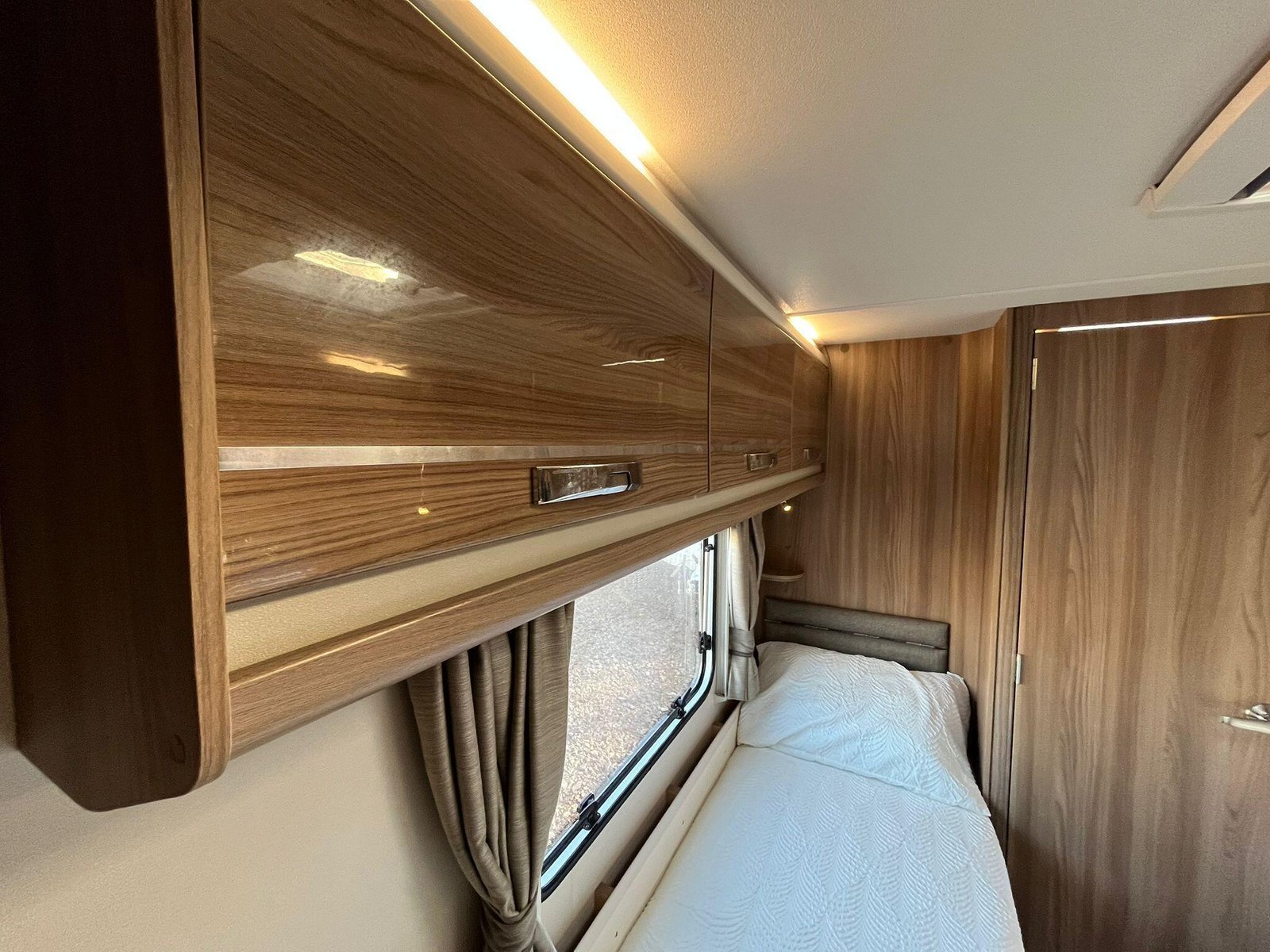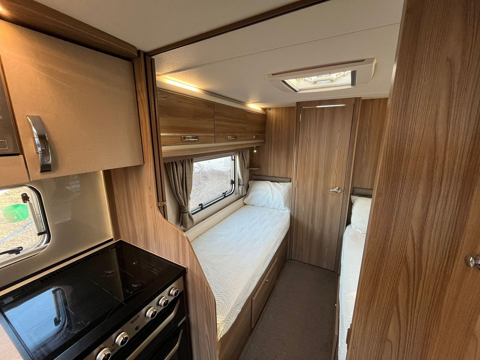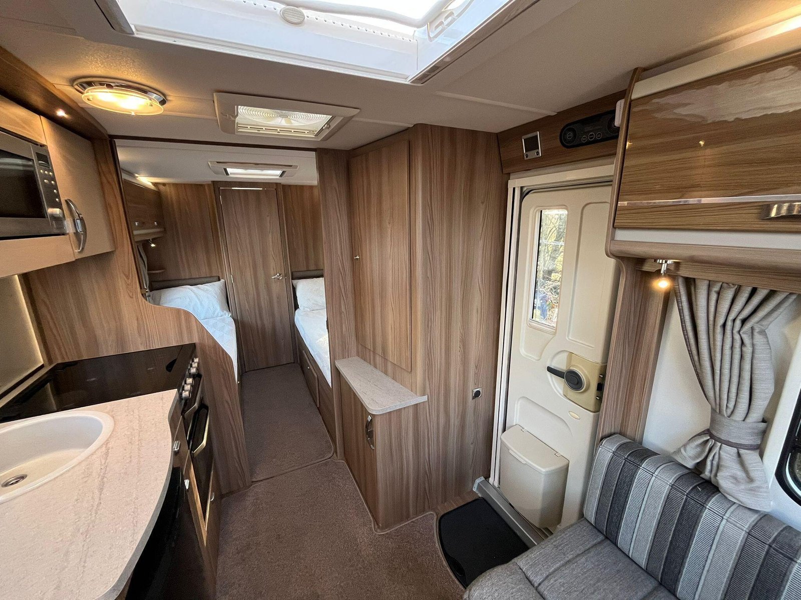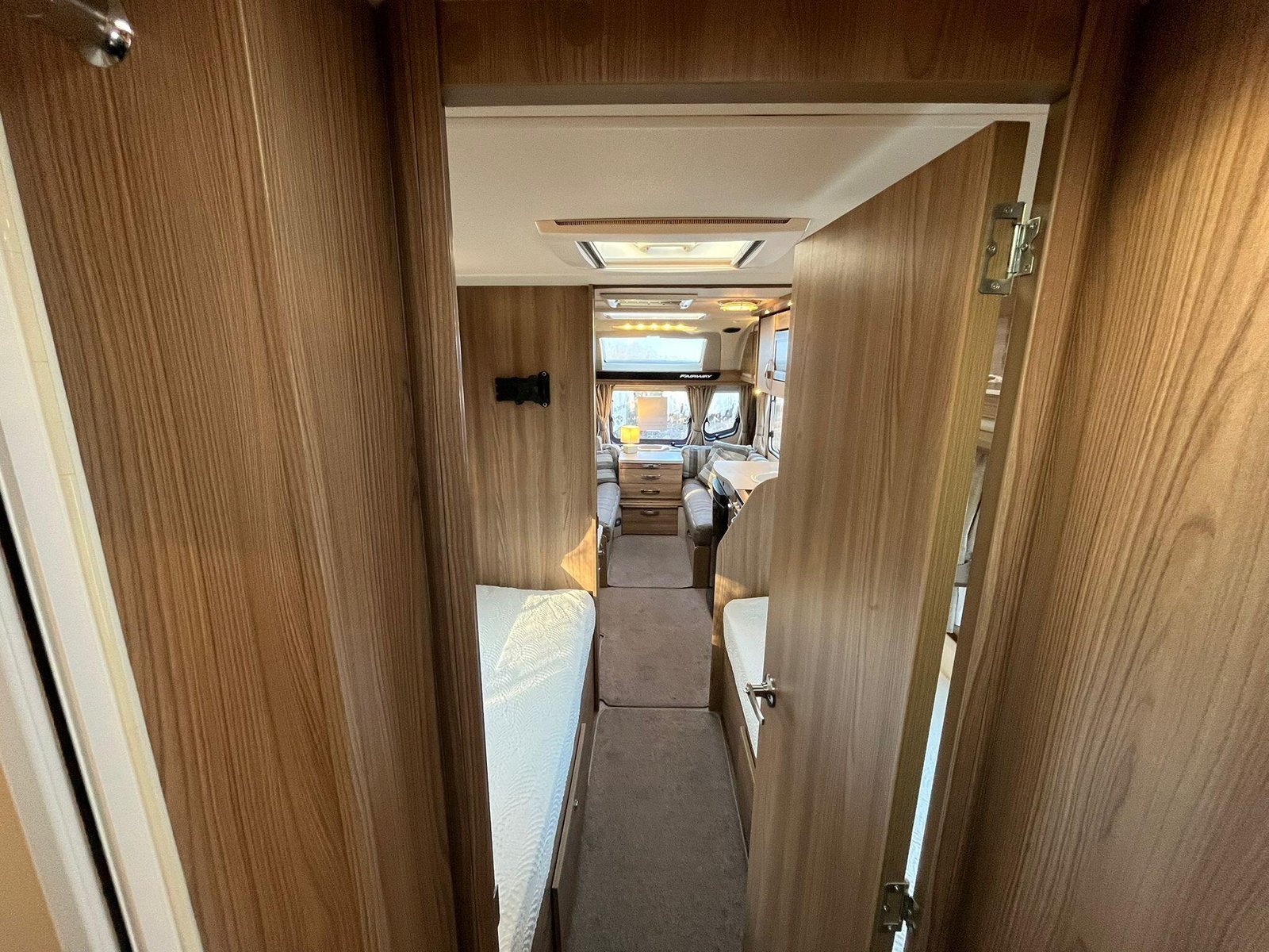 The 2016 Swift Fairway 565 is a four-berth touring caravan from Swift’s Fairway range that offers practical family-friendly accommodation and the familiar quality associated with the British manufacturer. Built on a single axle with a conventional layout, the 565 includes a spacious front lounge area whose bench seating converts into a large double bed, letting you relax or sleep in comfort and versatility. Towards the rear there are fixed twin single beds that provide easy access and separate sleeping spaces, ideal for families or couples who prefer their own sleeping arrangements. At the back of the caravan a full washroom area with facilities provides an integrated space to freshen up without having to leave the caravan.The interior is designed to make the most of available space with overhead lockers and under-seat storage, and a central kitchen area equipped with essentials for meal preparation such as a hob, oven and fridge. This particular Fairway 565 is enhanced with Al-Ko ATC (Automatic Trailer Control), which adds an extra layer of stability and confidence on the road by detecting and correcting trailer snaking, and ALDE wet central heating, delivering efficient and even warmth throughout the living and sleeping areas for comfortable year-round use. This model also includes extras like a solar panel and motor mover, helping with off-grid stays and easier manoeuvring on hardstanding pitches. Panoramic windows and rooflights bring natural light into the living area and help create an open, airy feel, while the combination of thoughtful features makes the Fairway 565 well suited to extended holidays and touring adventures.