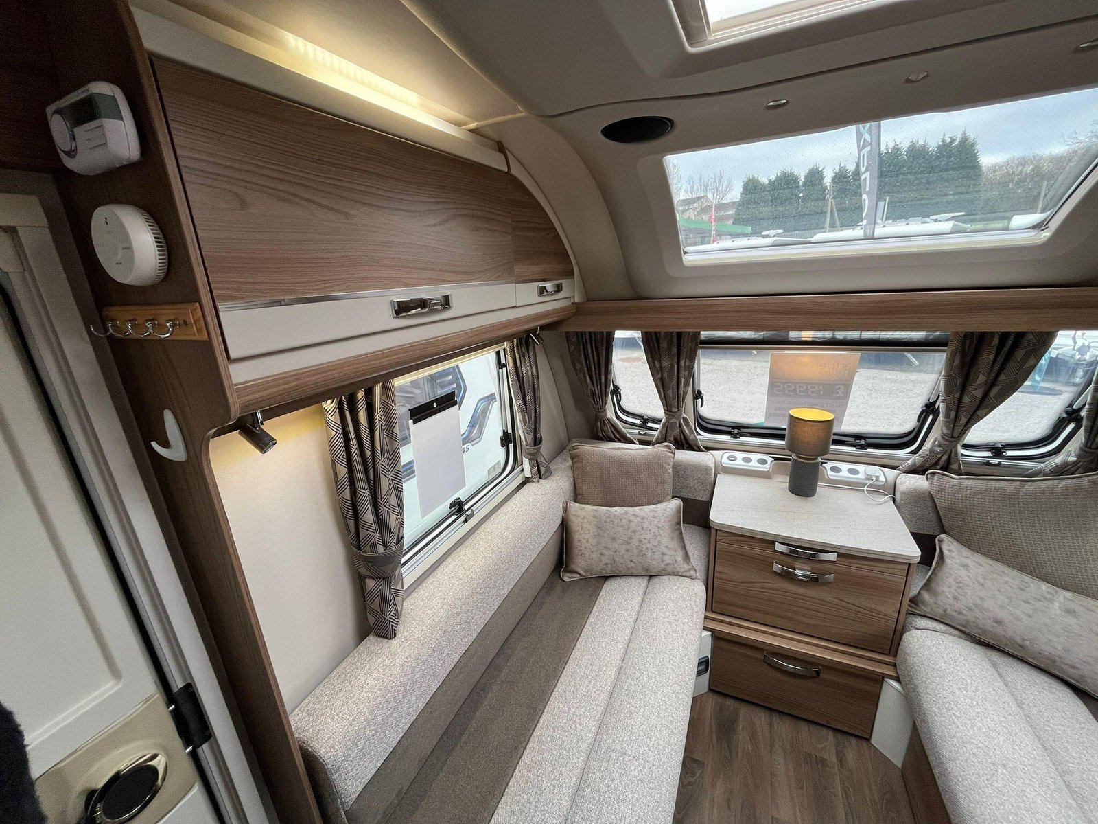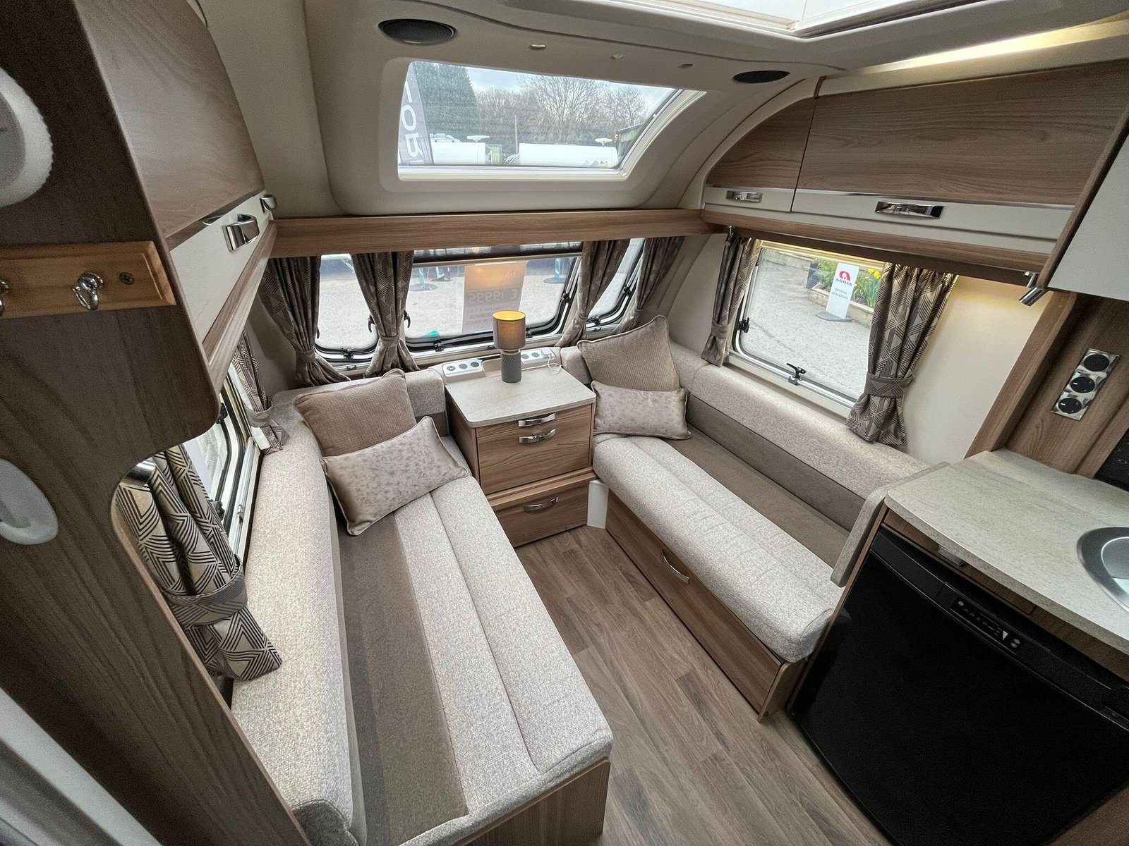 The well-equipped central kitchen includes a cooker with gas burners and electric hotplate, oven and grill, microwave and fridge with freezer compartment, along with good storage and worktop space. Towards the rear, the caravan benefits from a comfortable fixed transverse island double bed with storage beneath and overhead lockers.