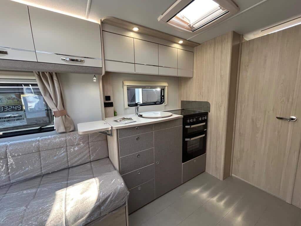 - Spacious Living Area: The 2025 Avante 860 boasts a vast living space with an elegant, contemporary design. Whether you’re relaxing indoors or hosting guests, this caravan provides ample room for comfort. The expansive lounge area is ideal for family gatherings or unwinding after a day of adventure, with soft, luxurious upholstery and abundant natural light.