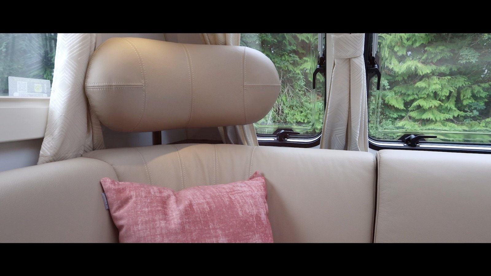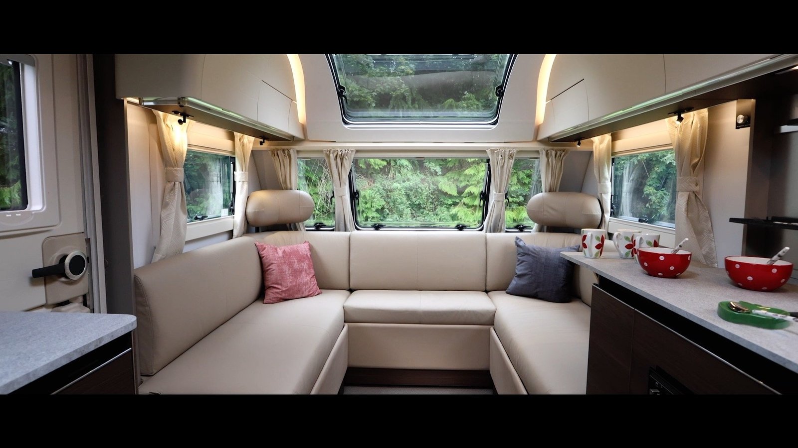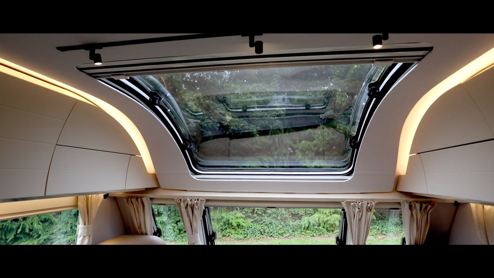 Inside, the first thing you notice is the impressive living space. The front lounge features a wide seating arrangement with luxury upholstery, deep cushioning and a dramatic rooflight that fills the area with natural daylight. This lounge can be converted into a large double bed, giving flexible sleeping arrangements for guests or family members.