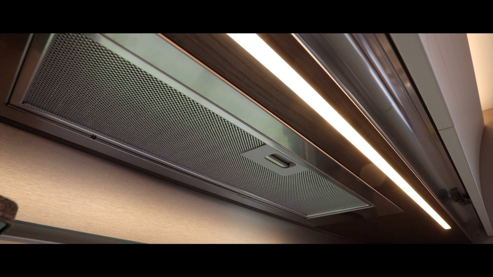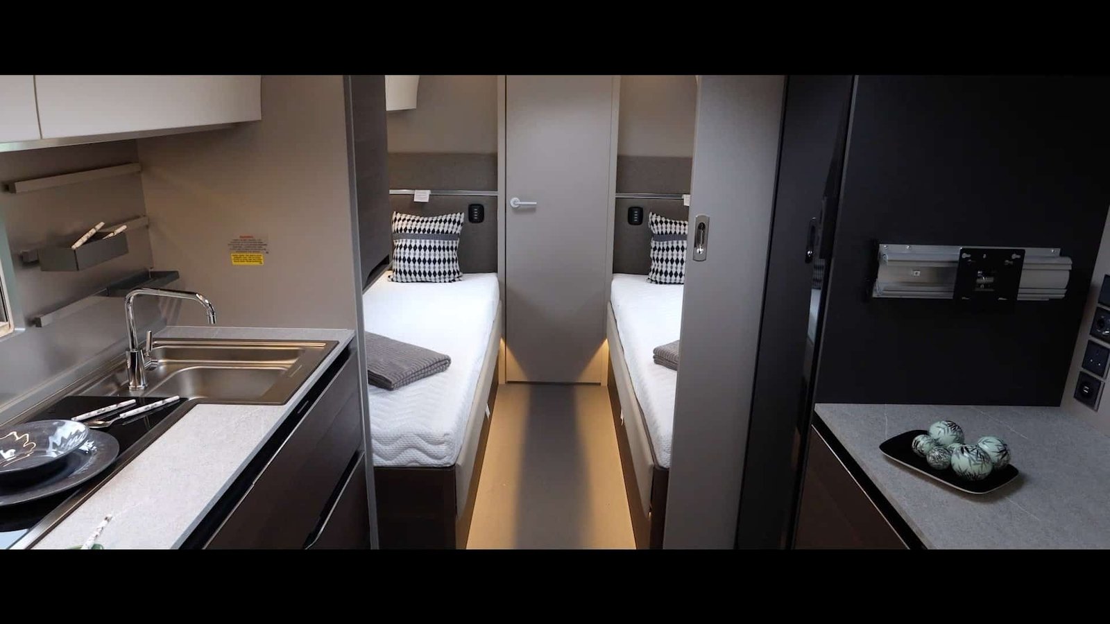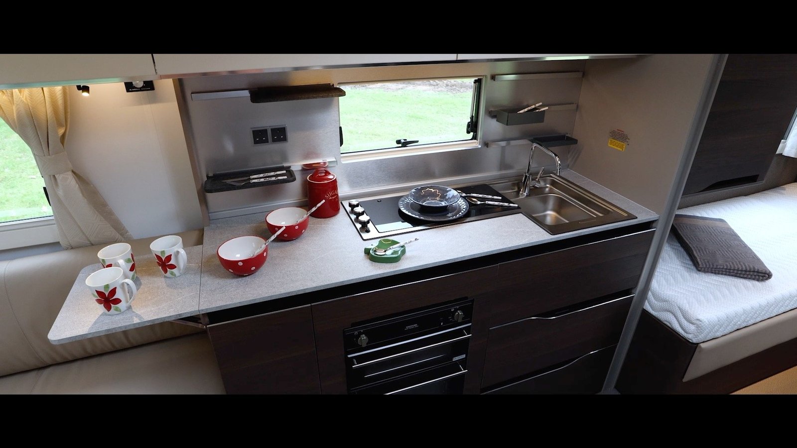 Inside, the first thing you notice is the impressive living space. The front lounge features a wide seating arrangement with luxury upholstery, deep cushioning and a dramatic rooflight that fills the area with natural daylight. This lounge can be converted into a large double bed, giving flexible sleeping arrangements for guests or family members.