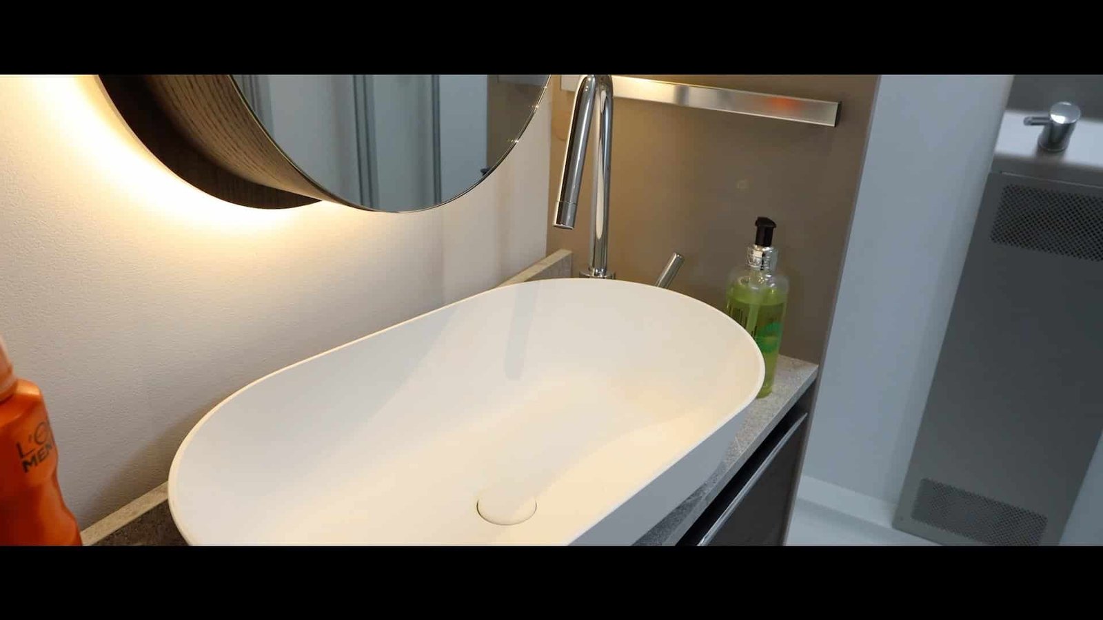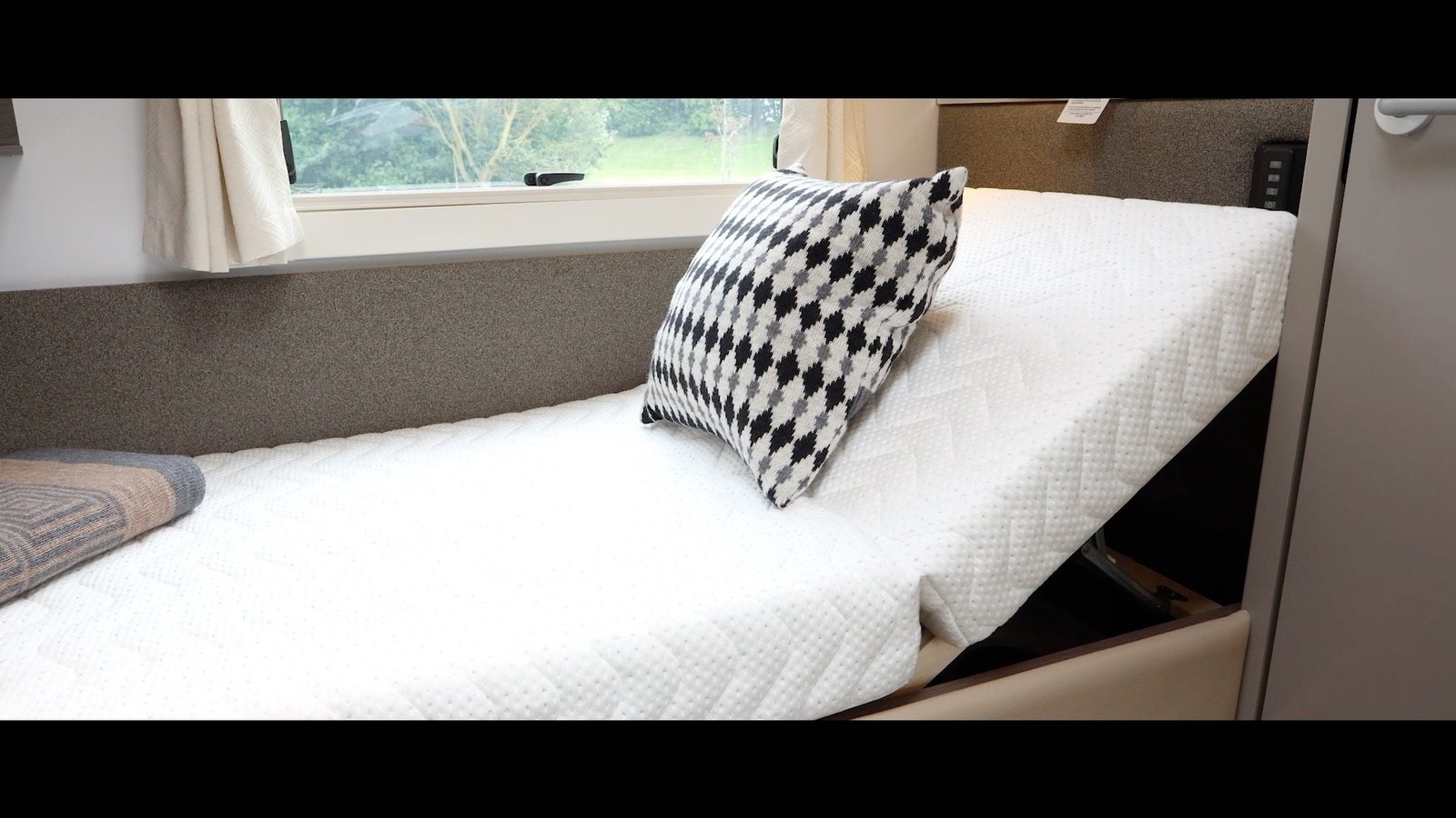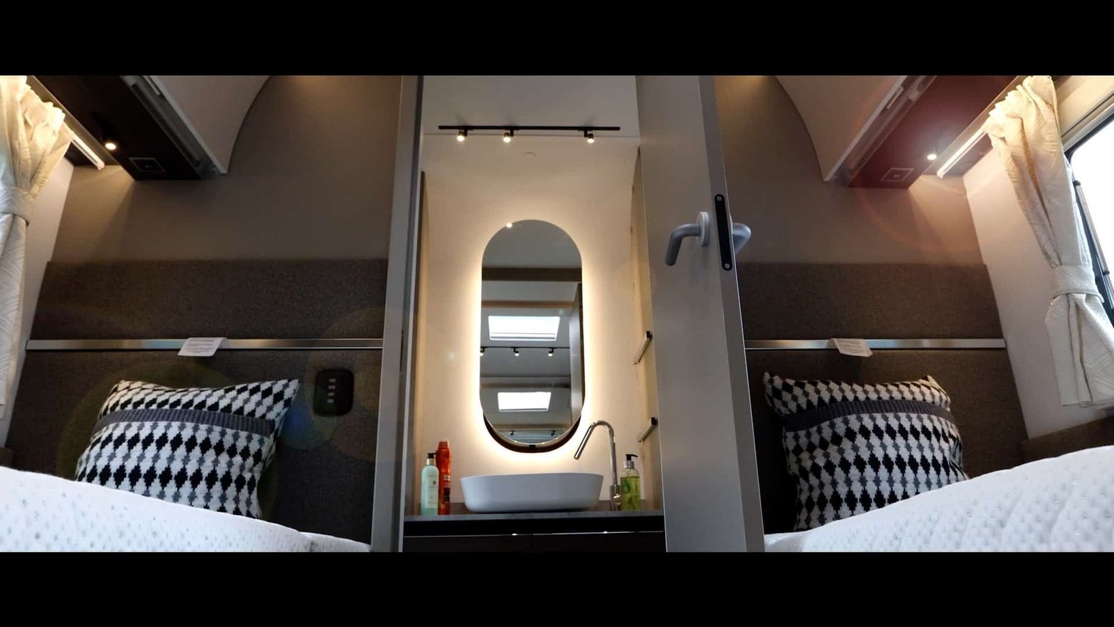 The washroom is also designed with comfort in mind, featuring a separate shower cubicle, modern basin, cassette toilet, illuminated mirror and practical storage options. It provides the convenience of a private en-suite, making longer tours even more enjoyable.