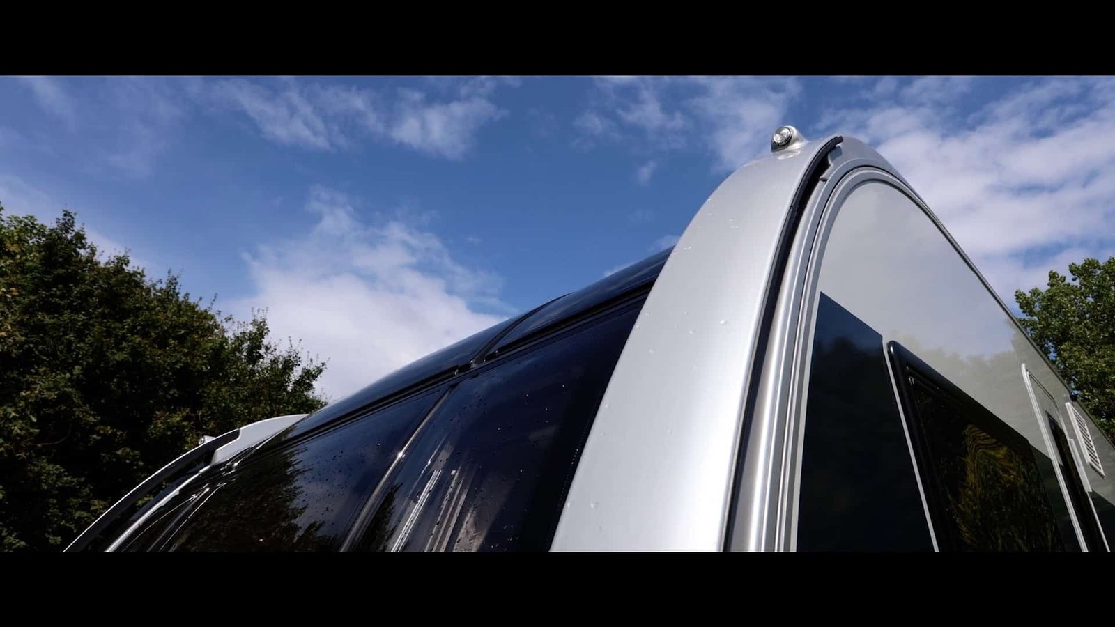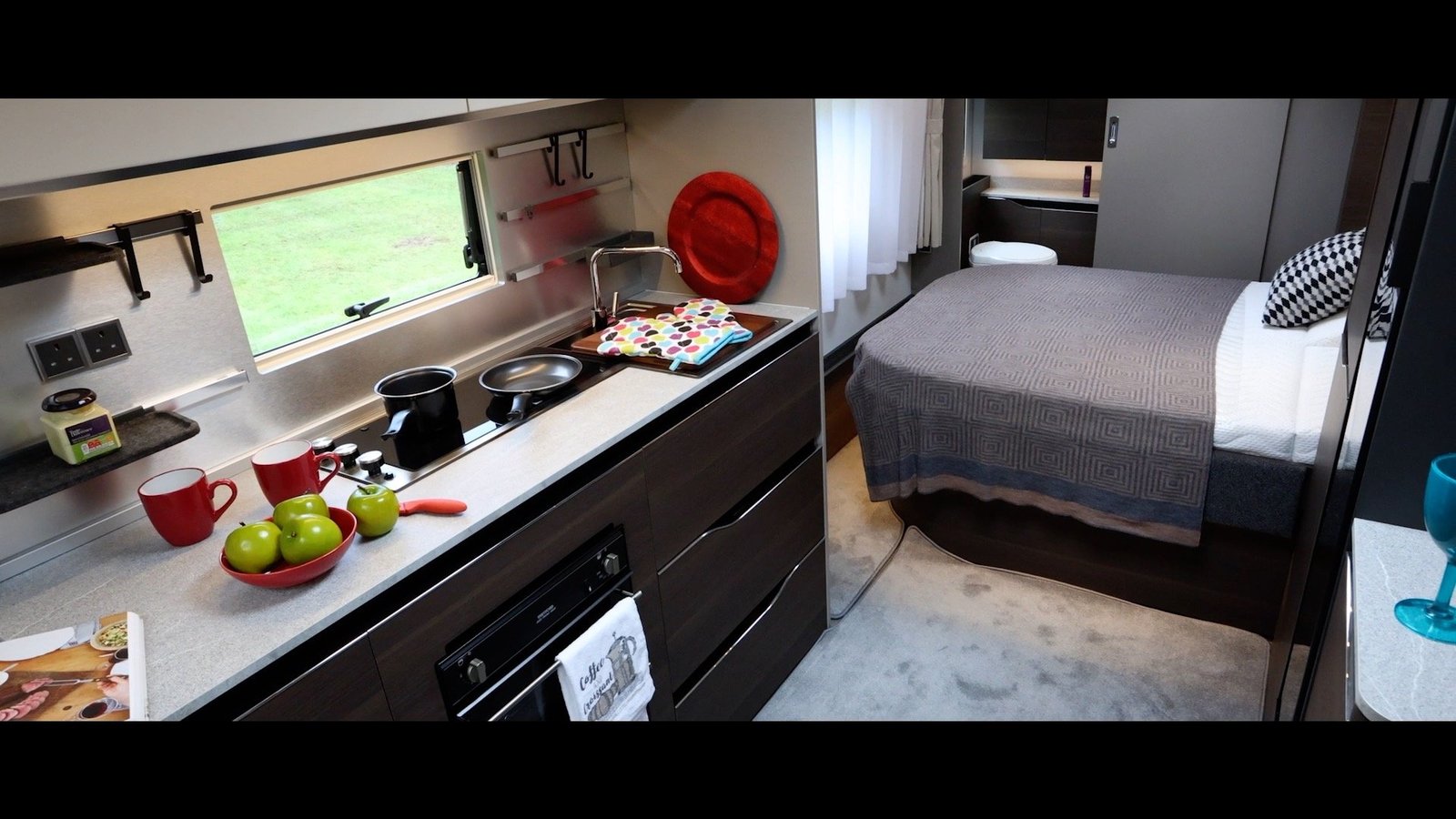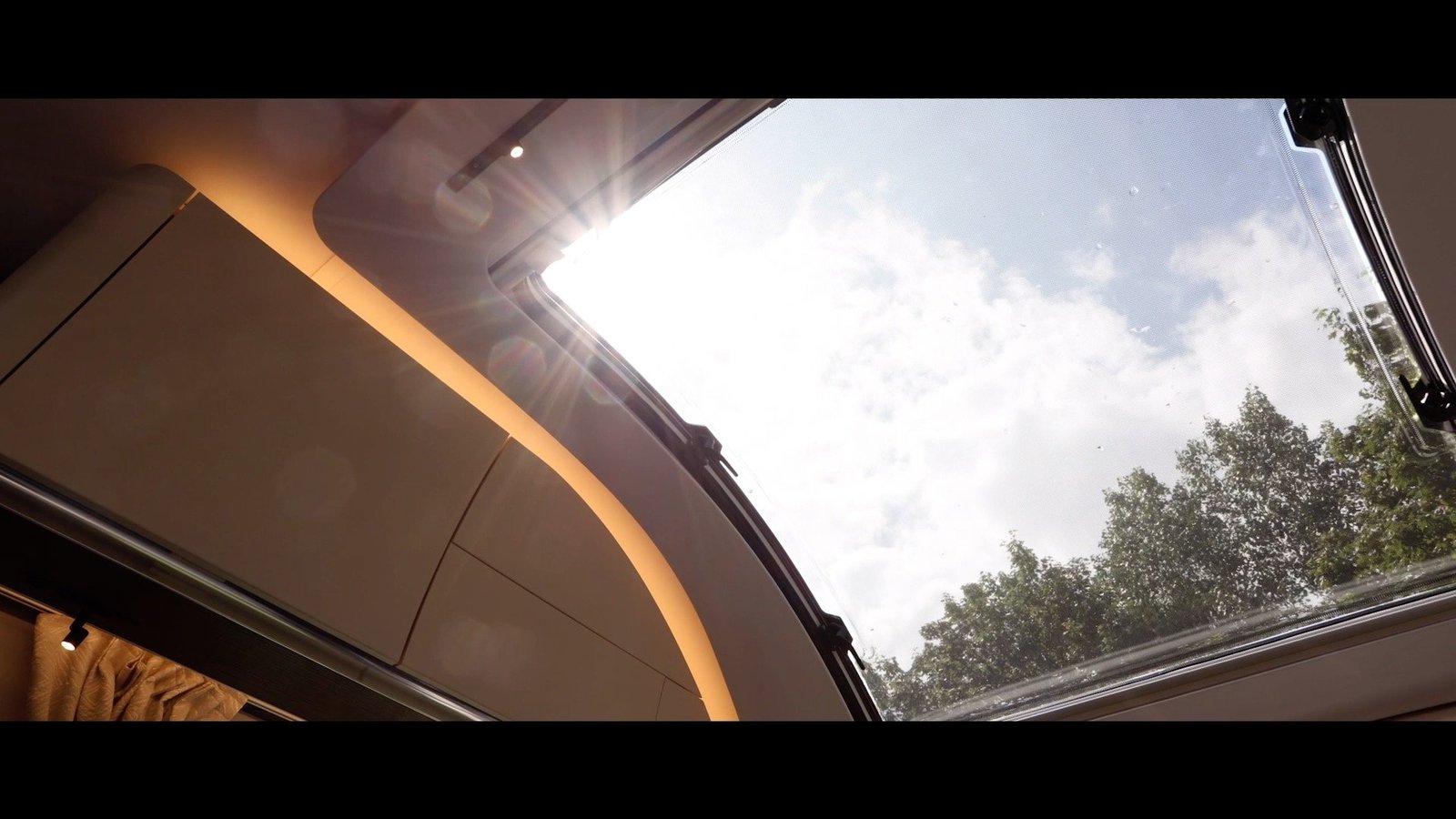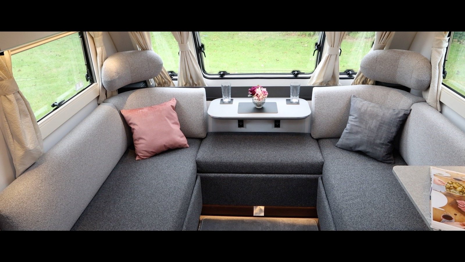Inside, the caravan delivers an experience closer to a luxury apartment than a traditional tourer. The expansive front lounge features deep, premium seating, a large panoramic roof window and contemporary soft furnishings. The space converts into a roomy double bed when needed, offering flexibility for guests or families.