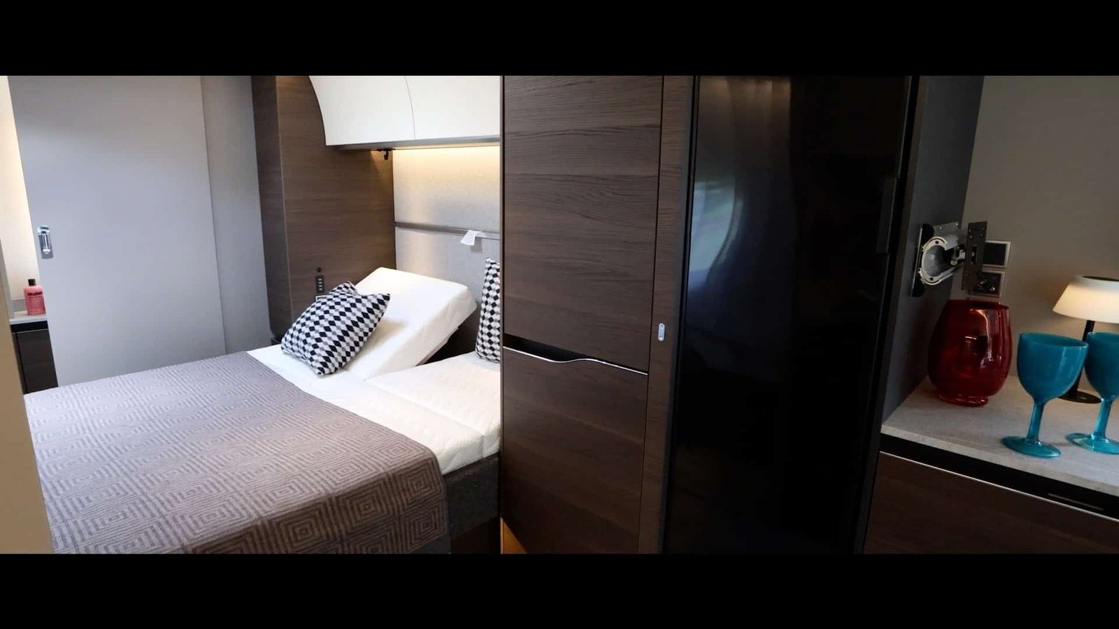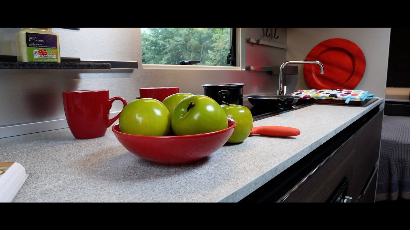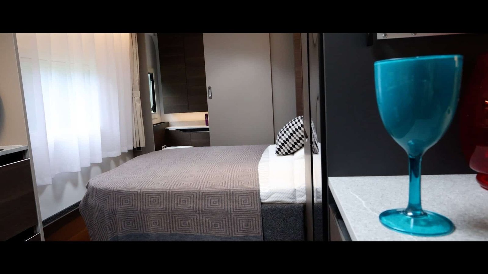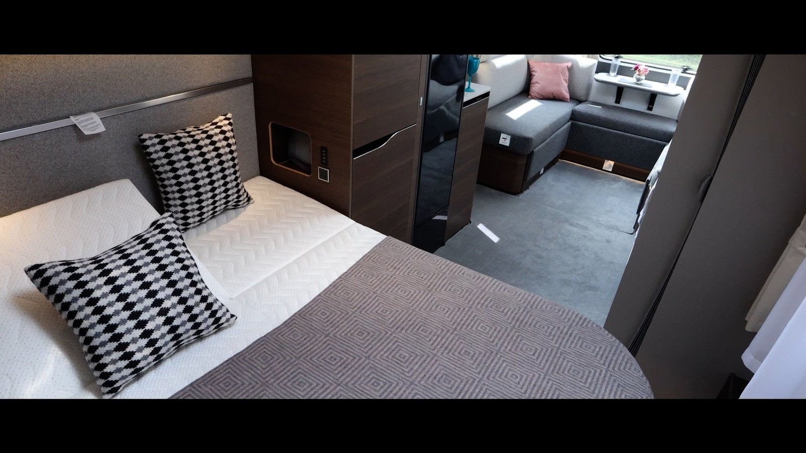 At the rear, the fixed island bed provides exceptional sleeping comfort, complete with walk-around access, overhead storage and a high-quality mattress. This private bedroom can be sectioned off from the living area, creating a peaceful retreat at the end of the day.