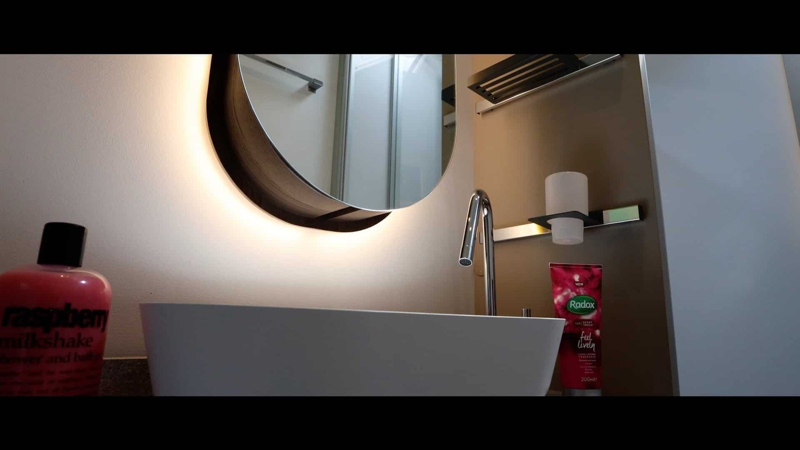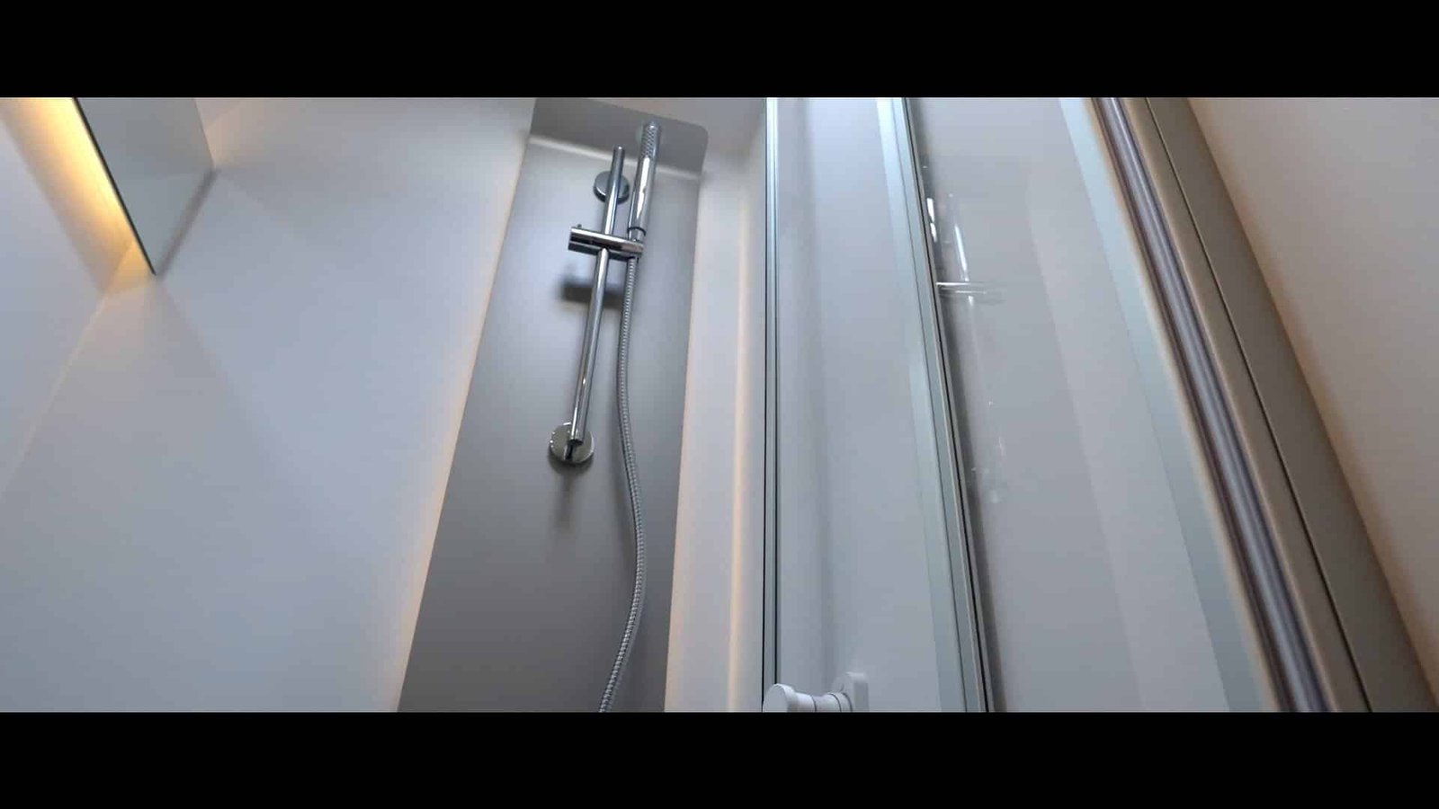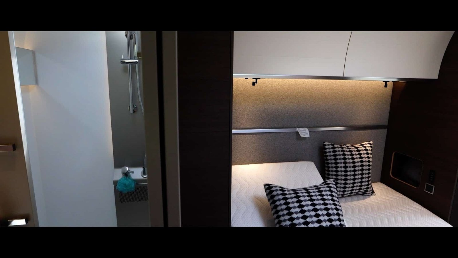 The washroom continues the luxury feel with a fully enclosed shower cubicle, modern basin, illuminated mirror and cassette toilet. Its thoughtful design maximises space while offering the premium touches expected from Adria’s flagship range.