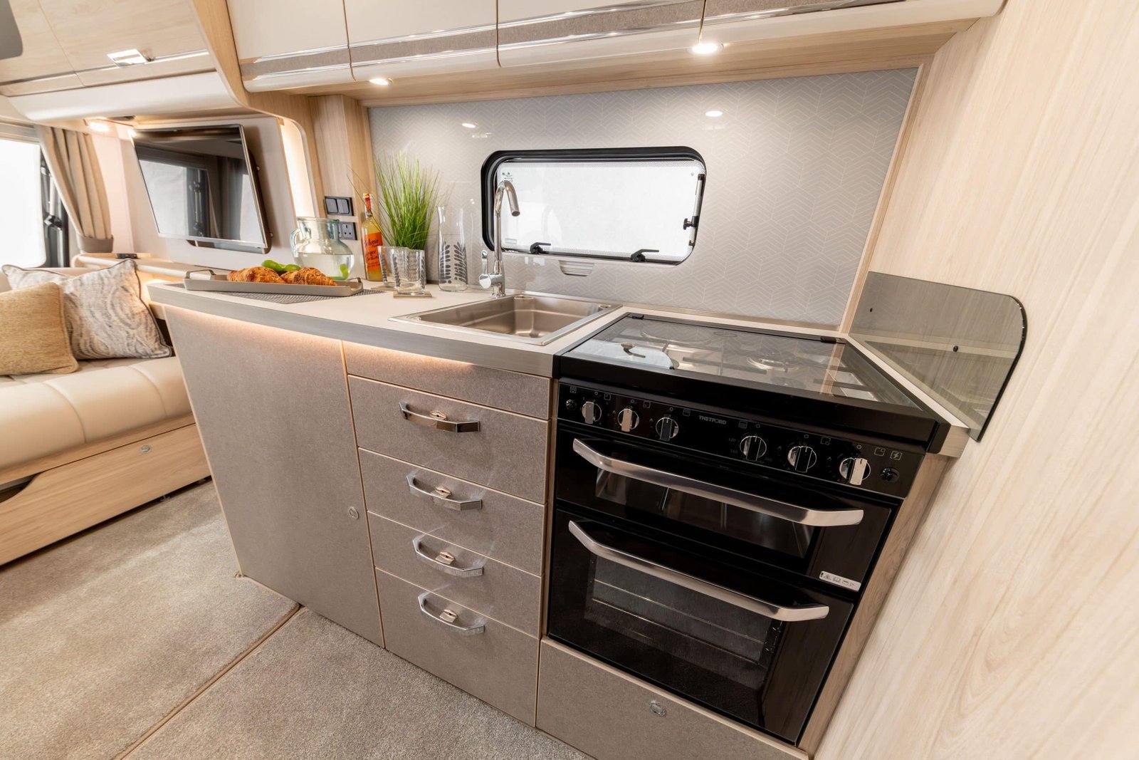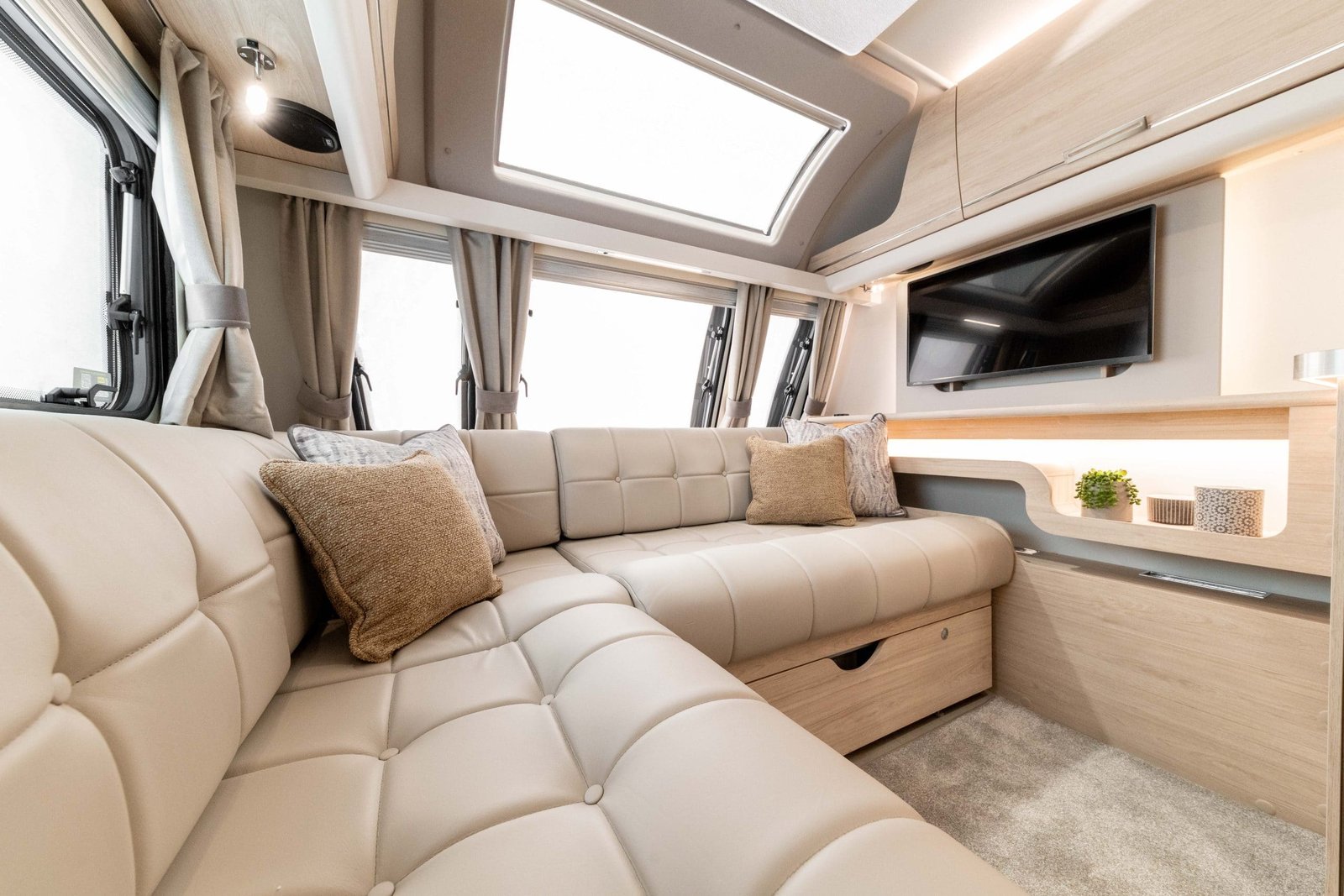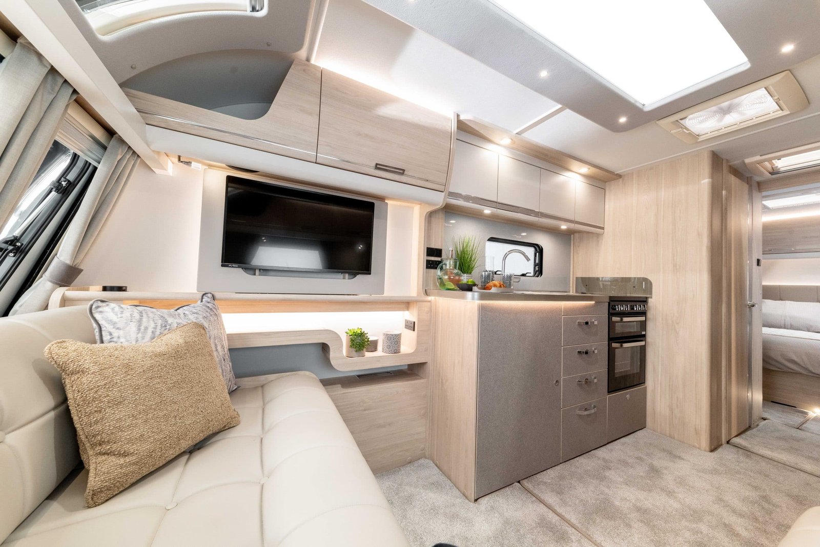 The premium interior includes a dedicated entertainment centre within the L-shaped lounge, complete with integrated shelving, inset lighting, and TV-ready setup, along with USB and mains charging points. The kitchen offers expansive worktops, ample storage, a sizable sink with cover, refrigerator and microwave provision, and thoughtful detailing for practical use. The rear bedroom delivers comfort and style with easy-access storage and a retractable island bed for added daytime space.