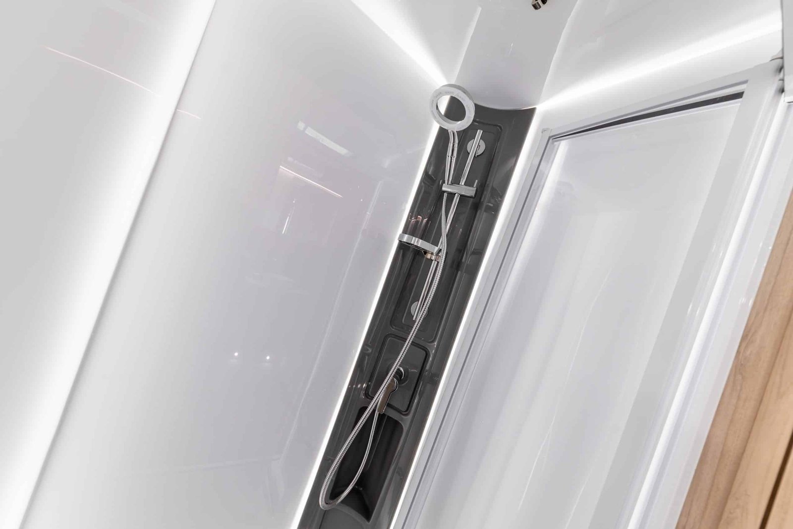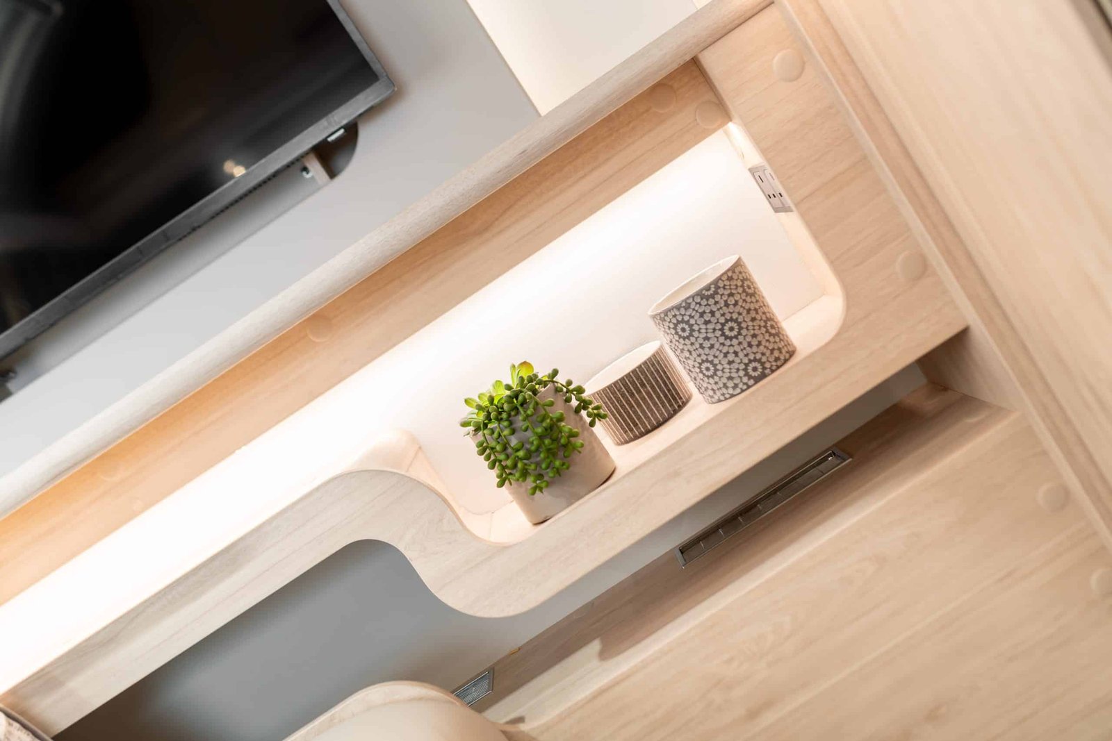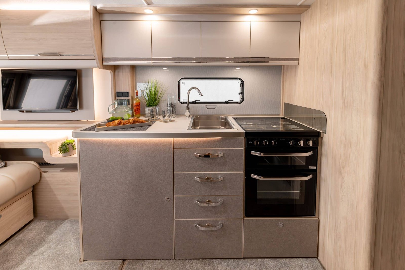 The premium interior includes a dedicated entertainment centre within the L-shaped lounge, complete with integrated shelving, inset lighting, and TV-ready setup, along with USB and mains charging points. The kitchen offers expansive worktops, ample storage, a sizable sink with cover, refrigerator and microwave provision, and thoughtful detailing for practical use. The rear bedroom delivers comfort and style with easy-access storage and a retractable island bed for added daytime space.