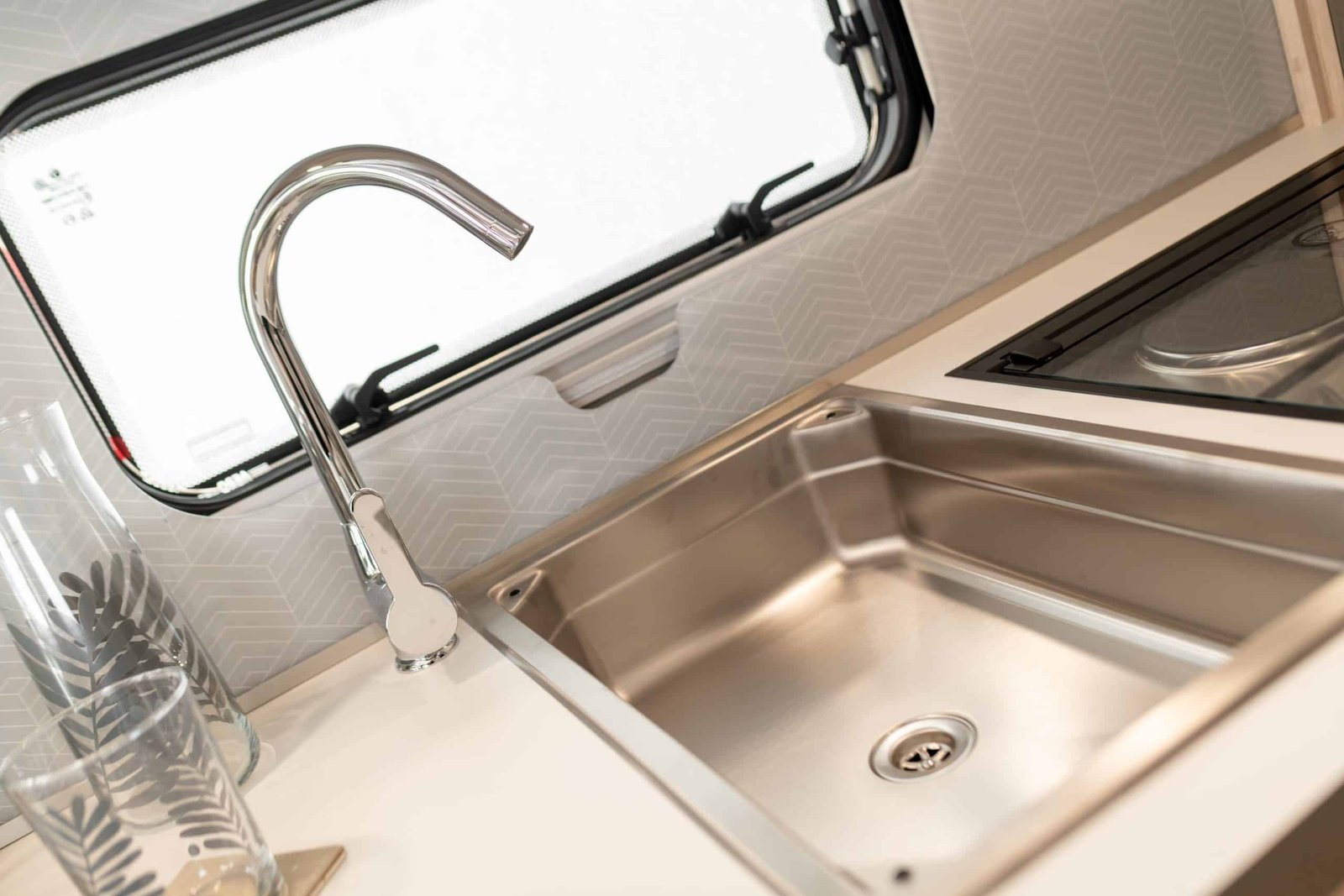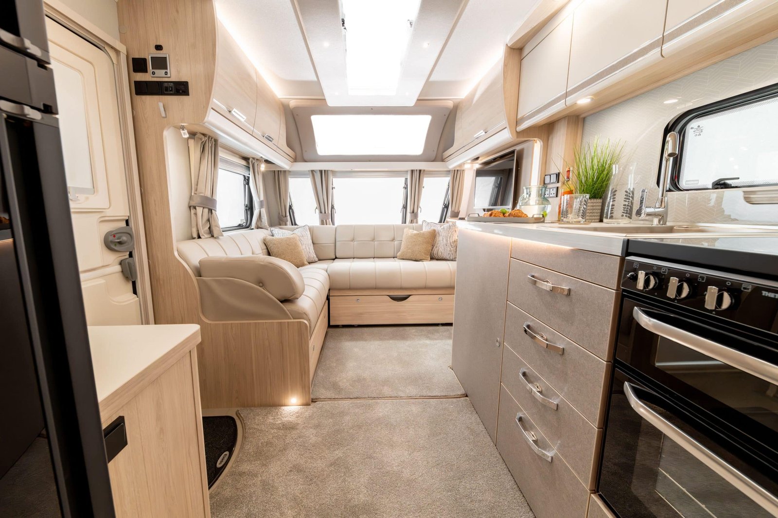 This eight-foot wide caravan features a robust build with GRP Sunsation high-gloss Rembrandt silver side panels for exceptional weather resilience and modern aerodynamic styling. Inside, the cabin is flooded with ambient light through a stargazer rooflight and front sunroof, while the Alde 24-hour programmable central and water heating system ensures year-round comfort.