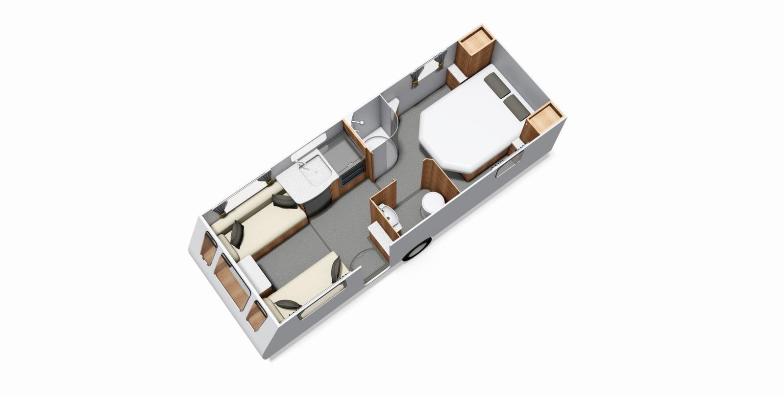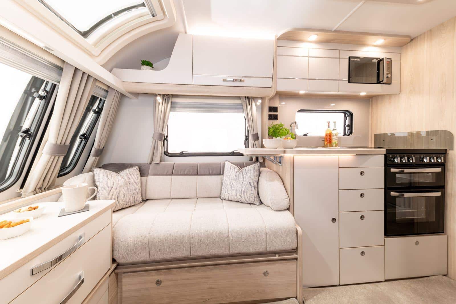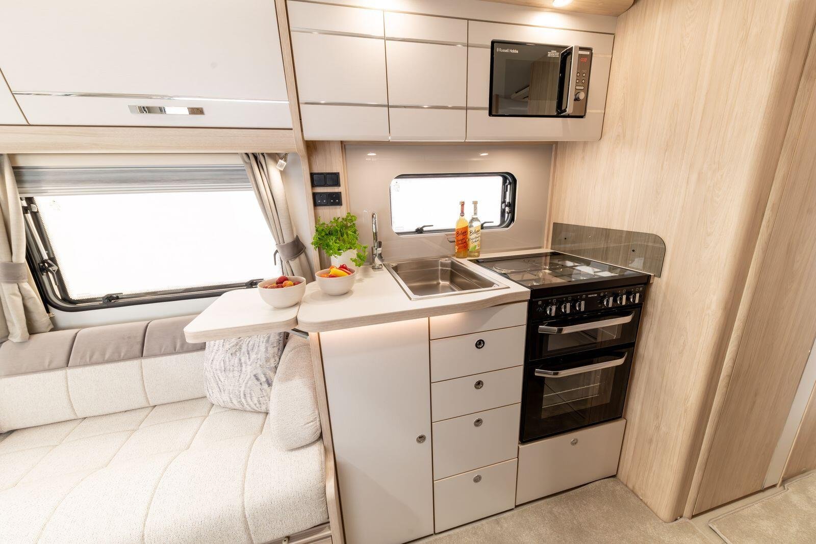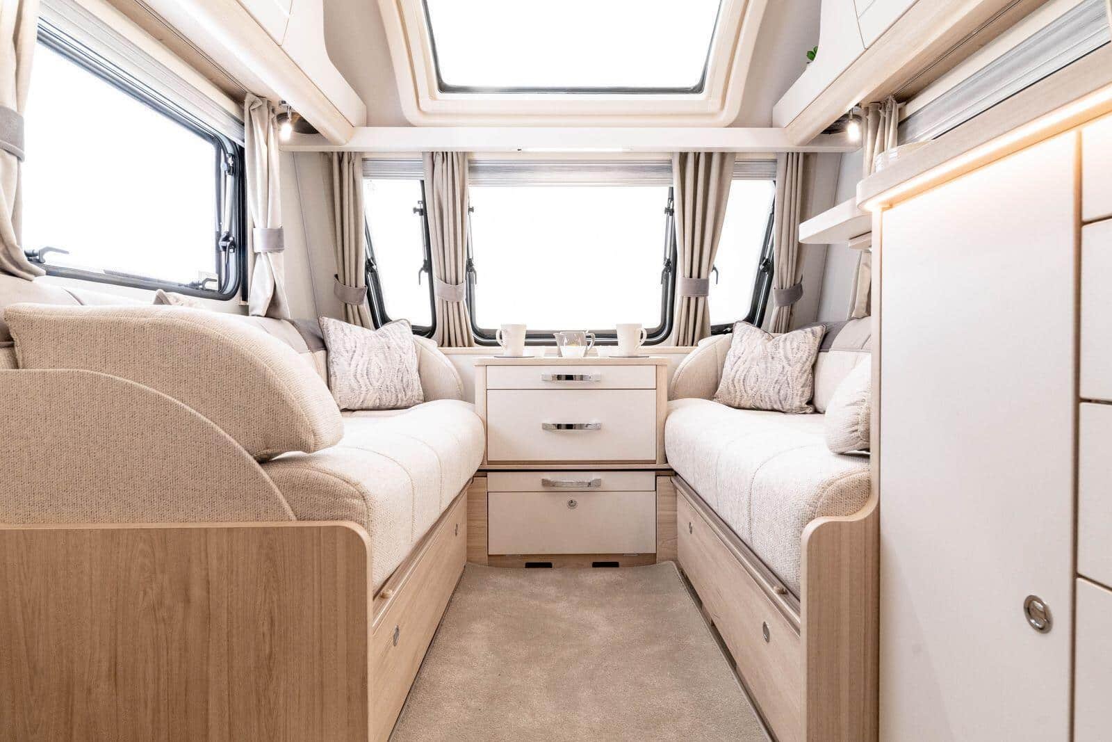 Storage is generous and well thought out, especially around the island bed, which retracts to create extra space during the day. The overall feel is refined and well finished, ideal for couples or small families who want a comfortable, high-spec caravan for regular travel.