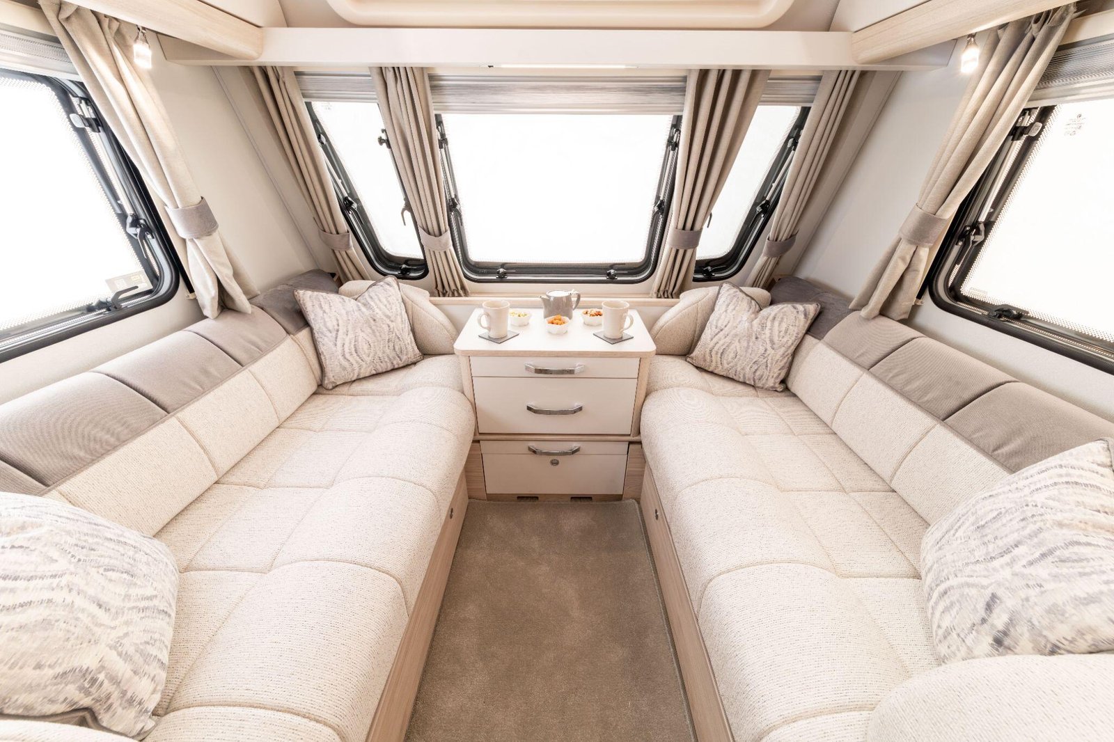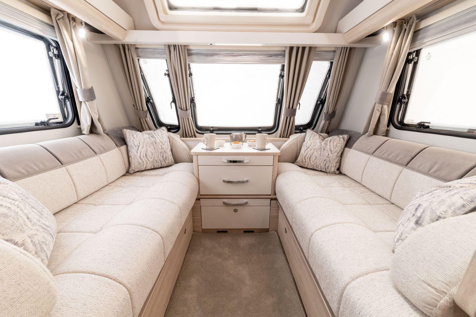 Inside, the caravans feature handcrafted cabinetry, soft-closing lockers, and dove-tailed drawers, with granite-effect contrasting worktops giving the interiors a premium feel. Lighting is fully LED throughout, with thoughtful placement to create both ambience and practicality.