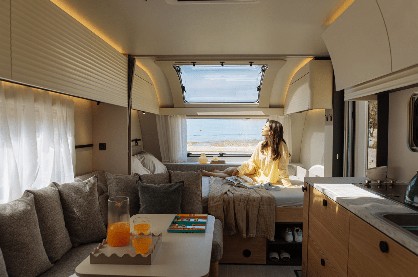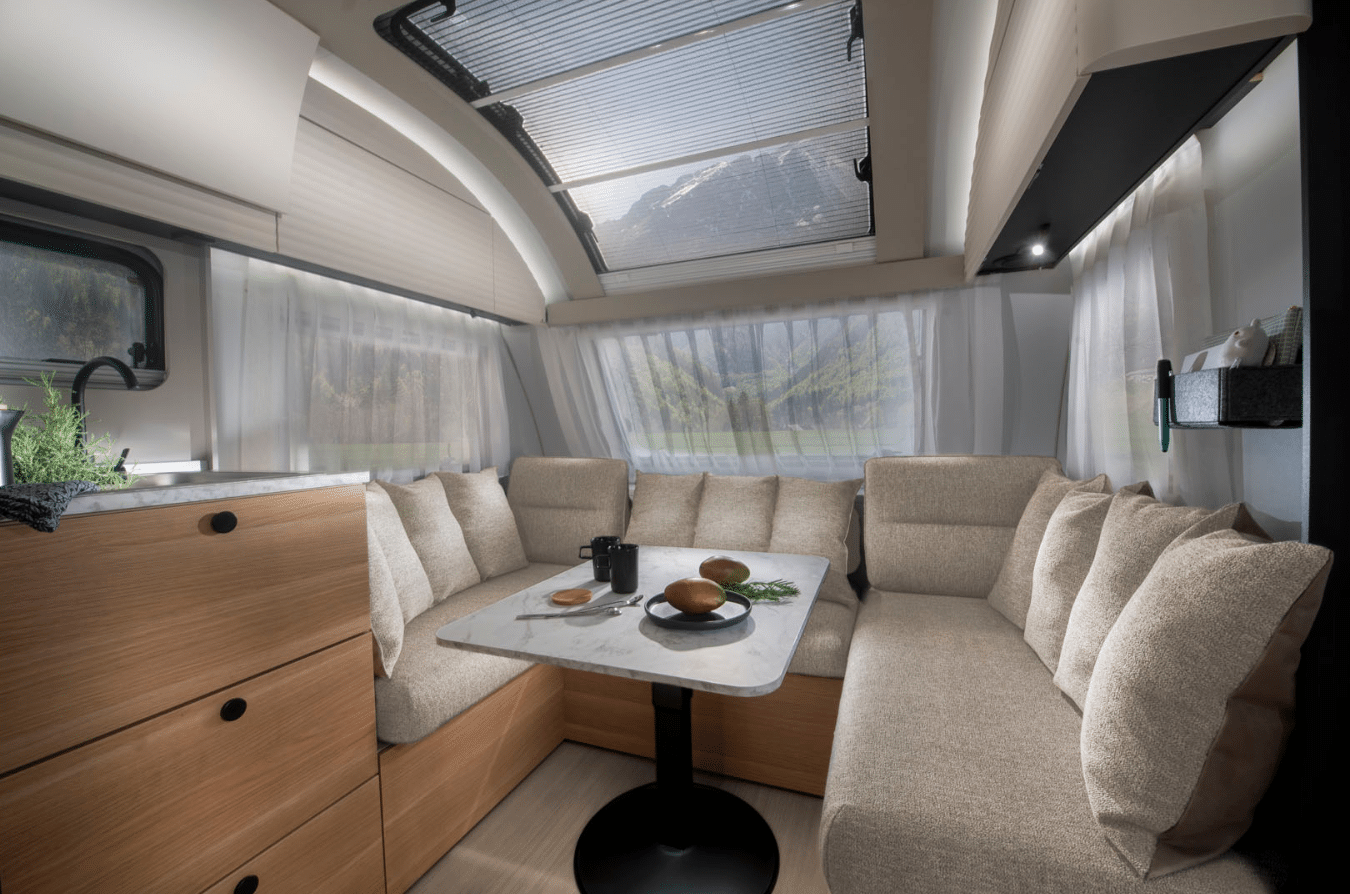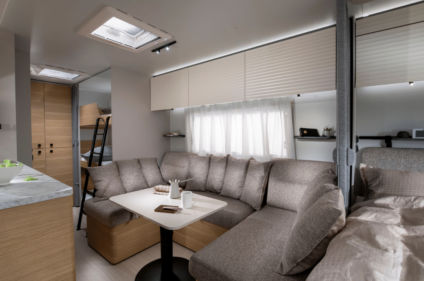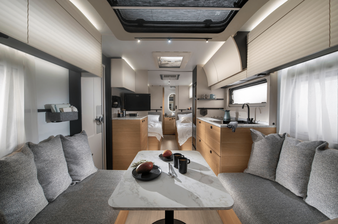 Thoughtful zoning within the caravan creates distinct living, dining and sleeping areas, ensuring everyone has their own space to relax.