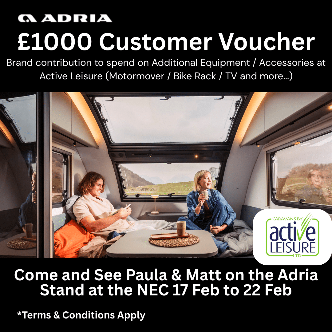 Active Caravans’ Paula and Matt will be on the Adria stand between 17th February and 22nd February, ready to: